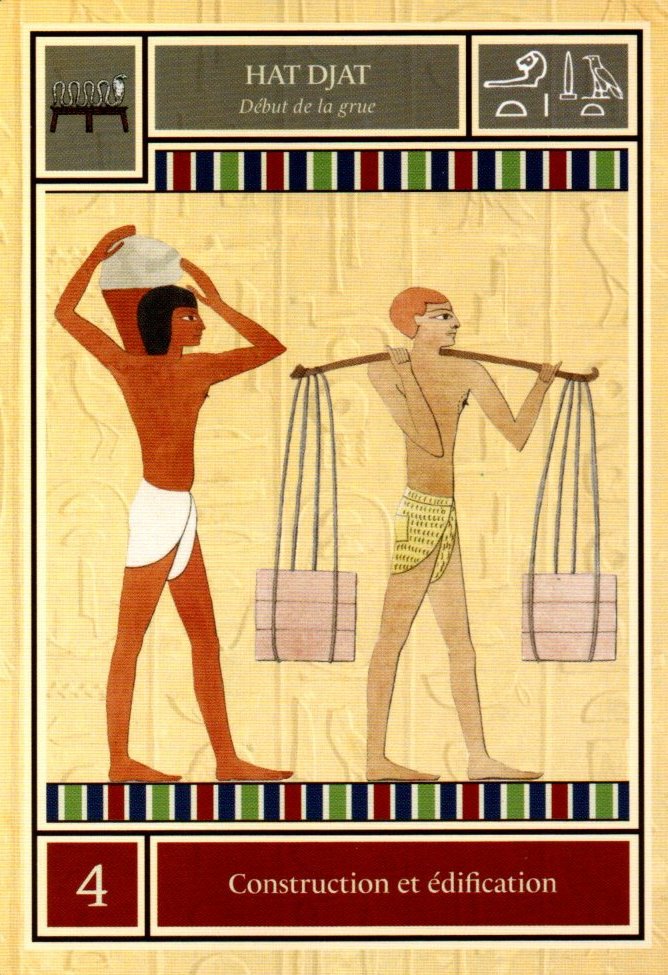 Le premier décan du groupe de la Grue représente la pause de fondations d'une réussite à venir. Il peut se référer au sens le plus littéral de la construction d'un édifice tel qu'une maison, mais doit également être entendu à un niveau plus métaphysique. Parce que Hat Djat est le début d'un nouveau groupe de décans, il indique aussi le début d'un projet qui impliquera votre travail ou votre carrière, d'où l'importance de poser des fondations.