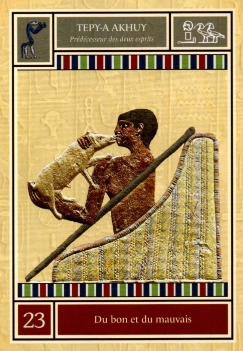 Cette carte à beaucoup en commun avec celle de la Tempérance dans le tarot, et si elle se trouve en conjonction avec Tpy-a-Khenet (décan 10), vous feriez bien d'examiner attentivement vos actions pour vous assurer que votre bonheur ne se fait pas aux dépens d'autrui. Le décan lui-même est dépeint comme tenant deux jarres : L'une déversant peut-être des bénédictions, tandis que l'autre pourrait contenir les conséquences cachées.