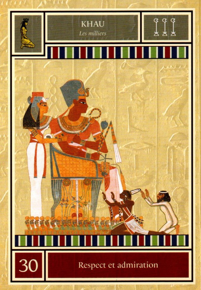 Cette carte peut être interprétée comme signifiant que le respect et l'admiration seront au rendez-vous ou que vous serez reconnu pour ce que vous avez fait. Sur cette image, peut-être êtes-vous le pharaon, qui est loué, ou peut-être une des personnes à genoux en train de louer un autre, ce qui serait un doux rappel de faire preuve d'humilité et de montrer à autrui respect et admiration. Y a-t-il quelqu'un en particulier dans votre vie que vous avez hésité à louer, alors qu'il mérite votre respect ?